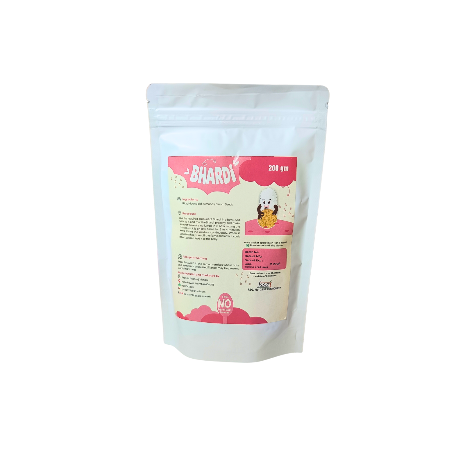 Bharadi Cereal is made with a simple yet powerful combination of rice and moongdal (split green gram). Rice provides a good source of carbohydrates for energy, while moongdal is a protein-rich legume that offers essential amino acids. This combination ensures a balanced and nutritious meal for your little one.
